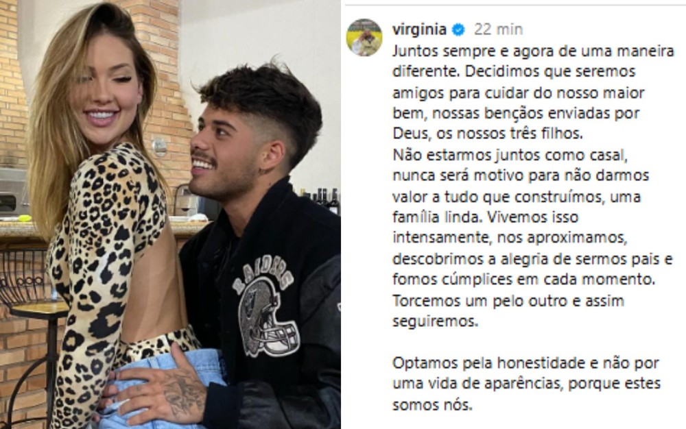 influenciadora Virginia e o cantor Zé Felipe anunciaram que estão separados. Em publicação feita na noite desta terça-feira (27), eles escreveram que continuam torcendo um pelo outro.